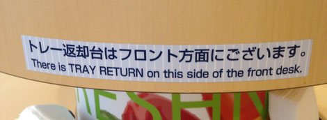 これは朝食バイキングがホテルであって、そこに書いてありましたが、英語を読んで "this side" ってどっちかな?と疑問に思いました。わからないですよね。食べる場所からフロントの方に向かっていくと返却場所がありました。