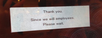 そしてこれは回転寿しのお店で最後に清算する時に画面に表示された英語。なんだかわけわかんないですが、従業員が来ますからお待ちください、ということを言いたかったのでしょう。